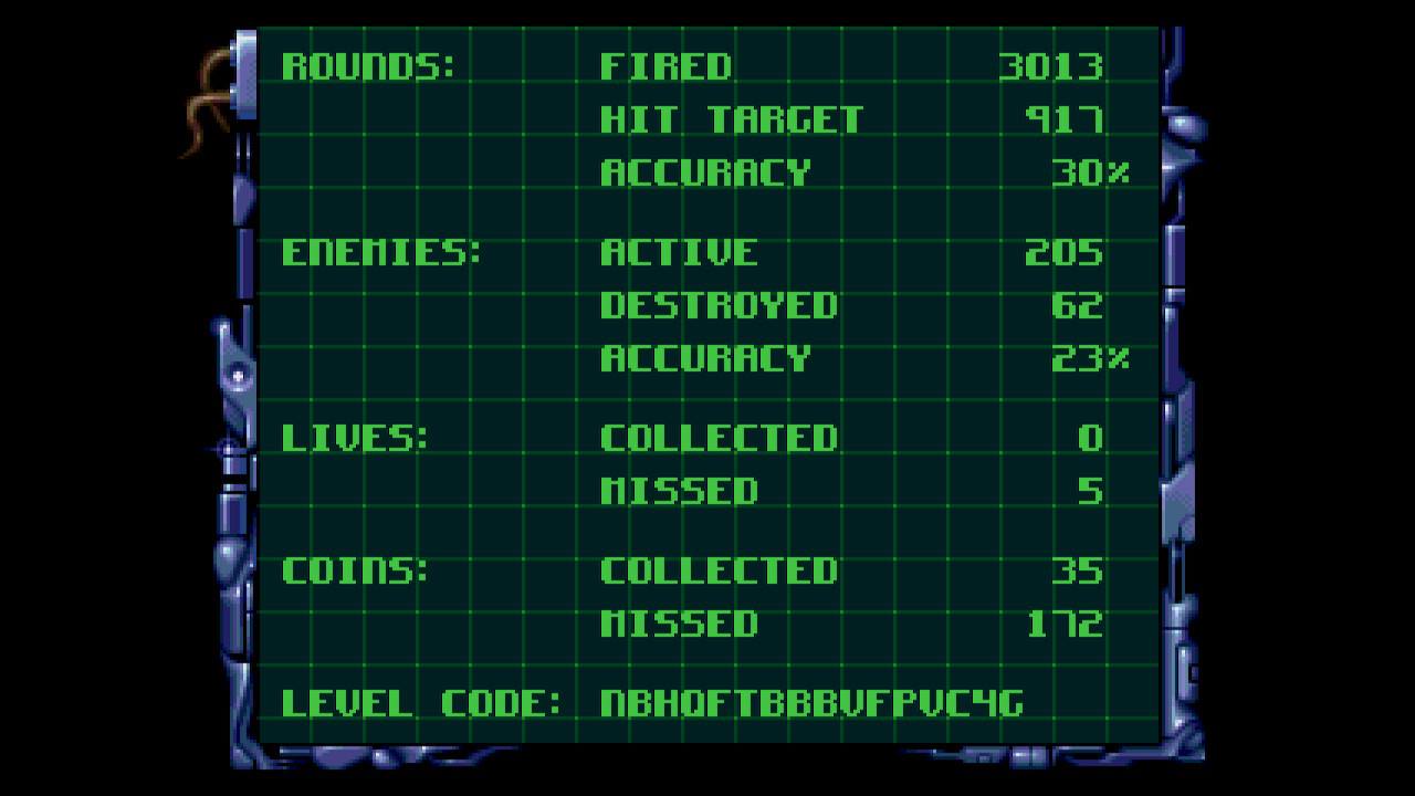 A chaque fin de niveau, un écran apparaîtra en indiquant vos statistiques effectués avec un code à « se retaper » (oui c’est le mot!!!) de 16 caractères alphanumériques permettant de reprendre au dernier niveau terminé.
