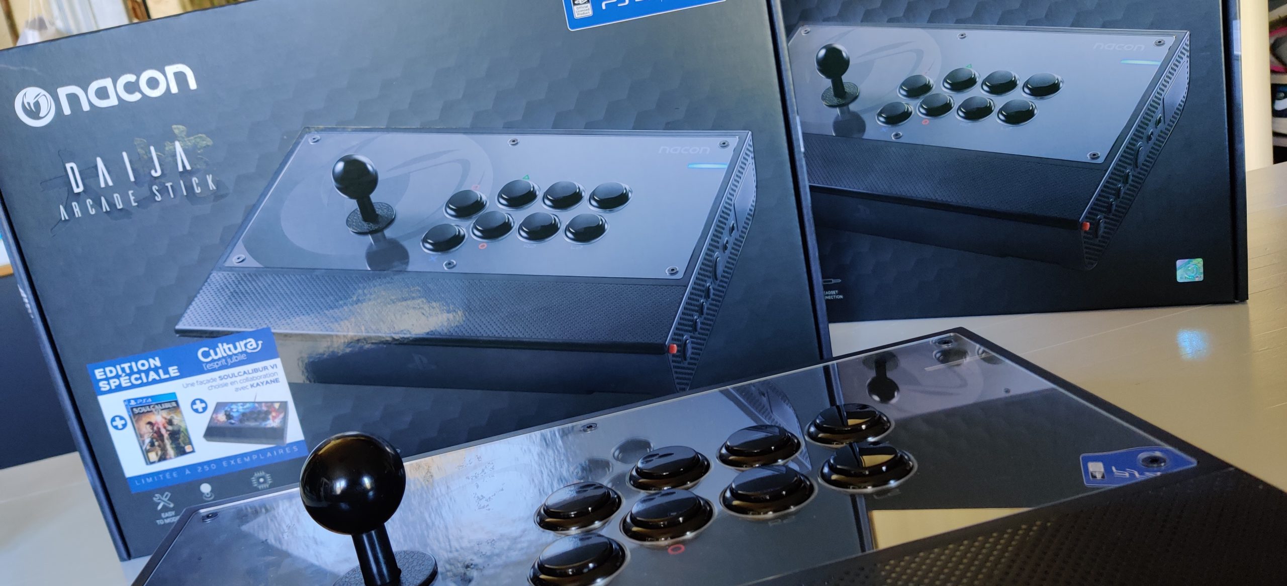 Il aura donc fallu passer par les soldes Cultura pour faire l’acquisition de ces petites merveilles que sont les Nacon Daija. Et pas n’importe lesquels puisqu’il s’agit des éditions exclusives contenant Soul Calibur VI et sa façade limitée à 250 exemplaires. Et au prix proposé, on a craqué pour 2 ! Je dis on, mais ce sont en fait deux belles pièces qui vont partir pour l’association ACJV. Préparez-vous à de belles journées Shoot et Baston avec ces périphériques, puisque compatibles PS3 (et PC).