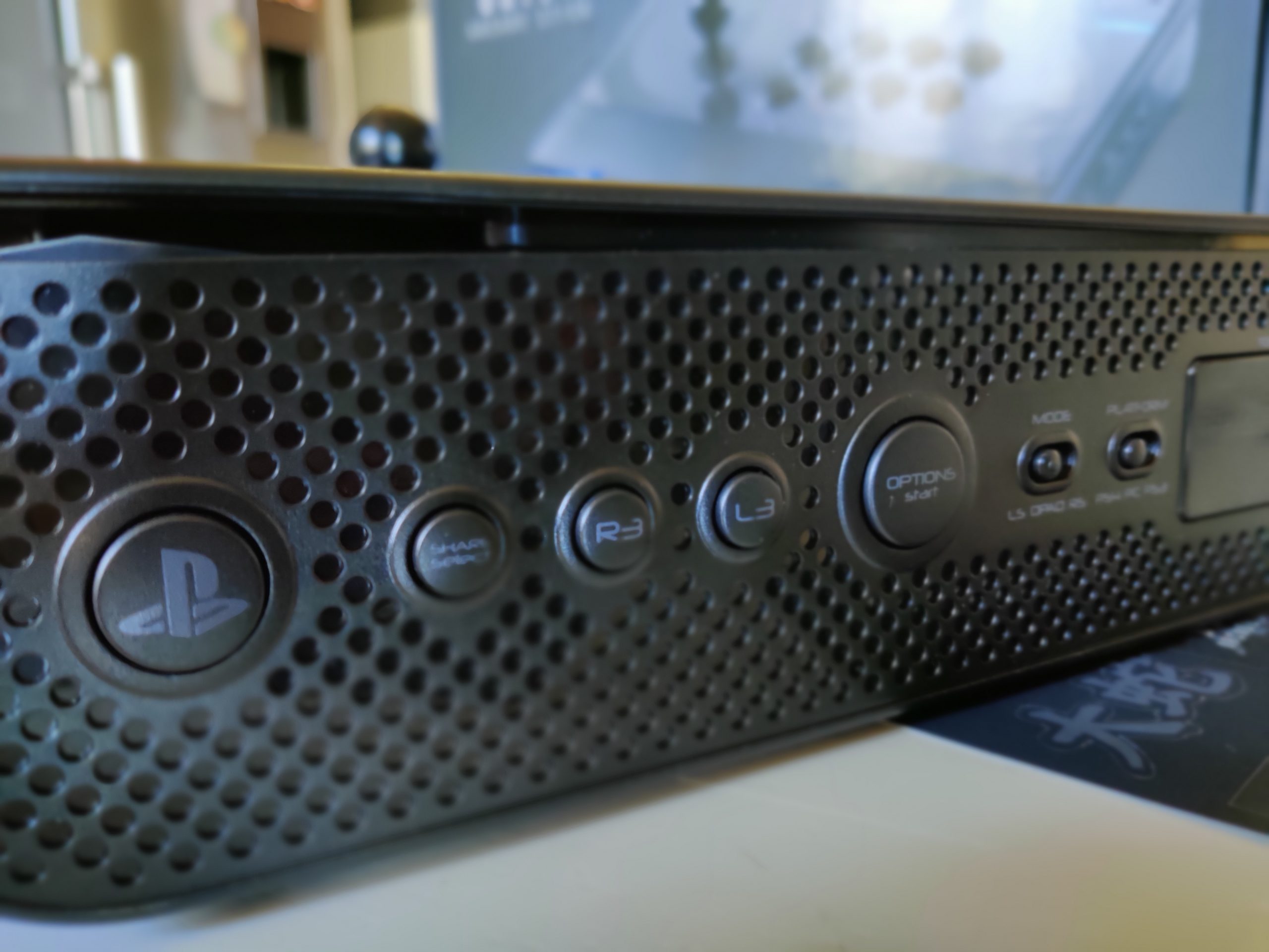 Sur la tranche droite il y a les boutons Start, PS, R3 et L3, le pavé tactile ainsi qu’un bouton permettant de sélectionner la machine utilisée, à savoir PS4, PS3 ou PC. Ils sont assez faciles d’accès et on apprend vite leur position.