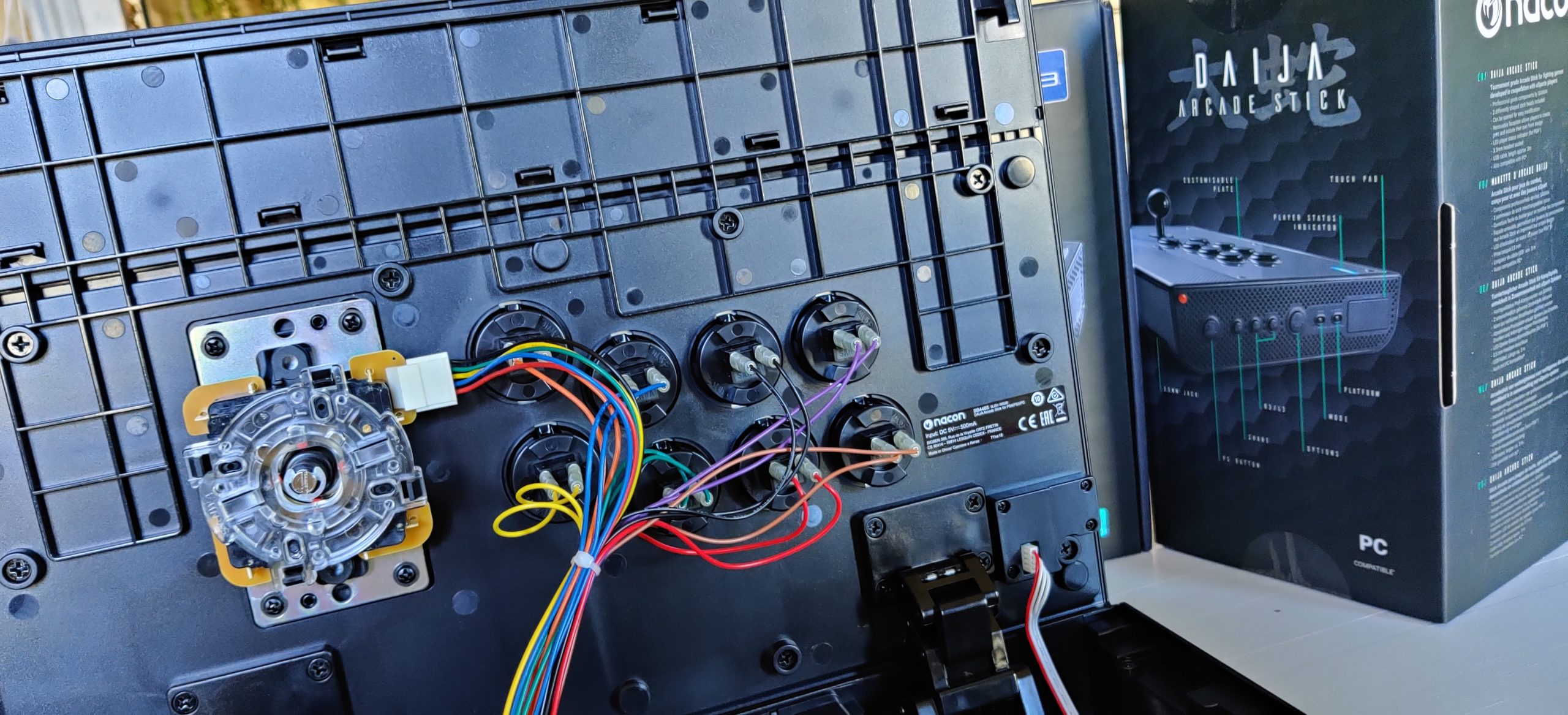 Les boutons et le levier sont de marque Sanwa. Au dos, un câble USB de 3m est attaché au boitier dans un compartiment de rangement très bien imaginé. En façade on retrouve un port casque.
