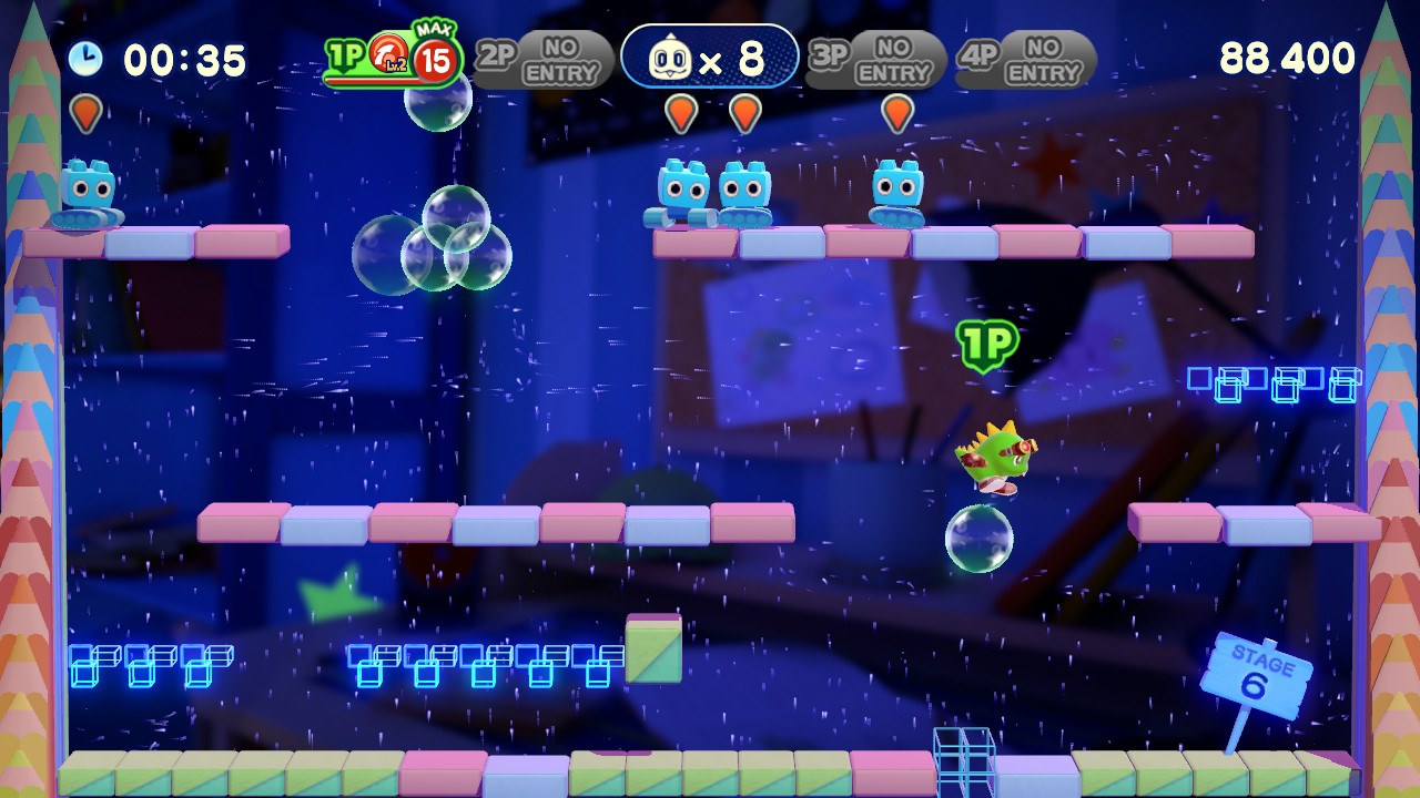 En terme de gameplay, rien de nouveau par rapport à avant, un bouton pour sauter, un bouton pour cracher ses bulles, on peut rebondir sur nos bulles pour pouvoir monter plus facilement les plateformes élevées, éclater les bulles (avec notre tête ou notre derrière, chacun son style!!!!) et un bouton pour enclencher nos bulles à capacité spéciale (électriques, plus rapide, etc).