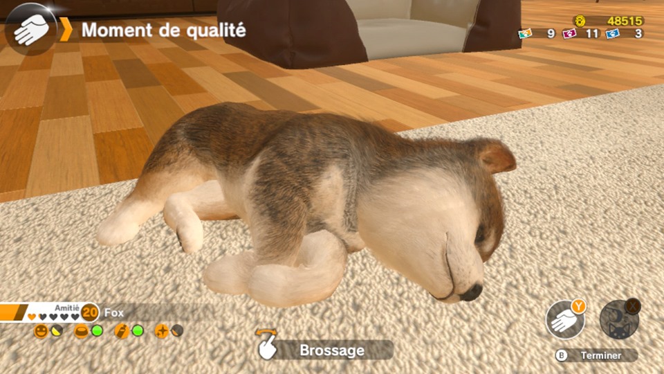 Dans ce jeu où l’on va vous demander de caresser votre ou vos animaux, l’écran tactile de votre Switch est immédiatement l’outil essentiel. Étonnamment, ce côté tactile n’est utilisé que pour votre animal. Brossages et caresses, mais cela s’arrête là. Vous voulez toucher un icone, ou une option ? Retour immédiat aux Joycons. Étrange, car si le mode portable est naturellement le plus approprié pour profiter pleinement du jeu, l’expérience tactile n’est ainsi pas poussée à son paroxysme. Autre possibilité, jouer sur votre télévision en mode docké. Sachez le, votre Manette Pro est désactivée immédiatement. Il faudra passer par le Motion Gaming pour pouvoir éduquer tous vos canidés ou vos félins. Réduit à l’utilisation des Joy Cons, ce qui devait être un bon moment, ce révèle moins intuitif. L’usage du motion gaming n’est pas vraiment convaincant. Les plusieurs fois que j’ai pu tester, malgré la possibilité de calibrer constamment m’a amené à voir ma main gauche à la place de la droite et inversement sur l’écran de la télé. Je ne pensais pas que l’expérience HD allait me faire revenir 15 ans en arrière avec les Wiimotes. Décevant. Et puis caresser son chien avec le stick analogique n’est que trop peu immersif… Déjà sur un écran c’est quelque peu limité, alors là !