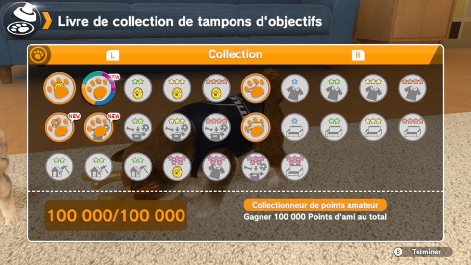 Enfin il y a les tampons à gagner suivant vos actions. Il vous en sera attribué un si vous caressez par exemple 10 fois votre ami, puis un autre pour 50 fois, ou bien si vous lui lancez 1000 fois le frisbee… (oui 1000 fois !). Attention à ne pas voir des frisbee partout !