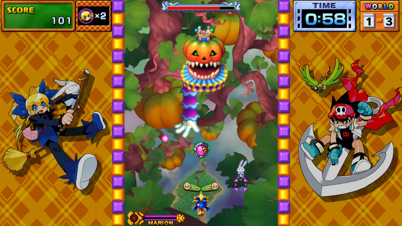 Parlons maintenant de Gunbarich un titre très original paru en 2001 sur borne d’Arcade uniquement. Ce spin off de Gunbird où l’on retrouve la petite sorcière Marion et son pote Gruton est assez particulier puisqu’il mélange Shoot them Up, casse brique et flipper.
