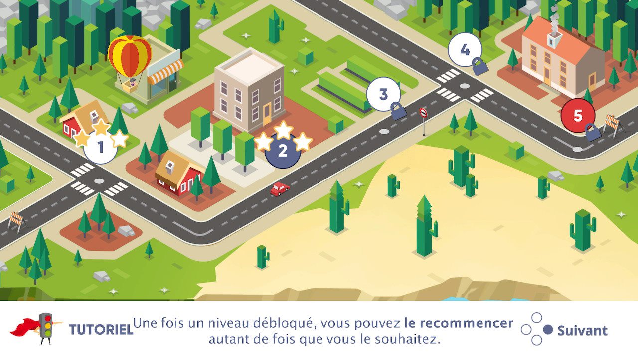 Pour débuter, le titre propose en multi ou en solo, un petit entrainement fort bien utile. Basé sur un système à la sauce jeux mobiles, vous devez débloquer les niveaux suivants en gagnant des étoiles. Comme indiqué sur la boite le contenu est conforme à l’examen. On se retrouve donc avec les images et vidéos que l’on trouve habituellement dans les Auto-Ecoles.