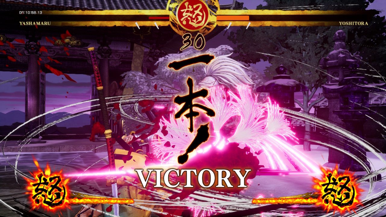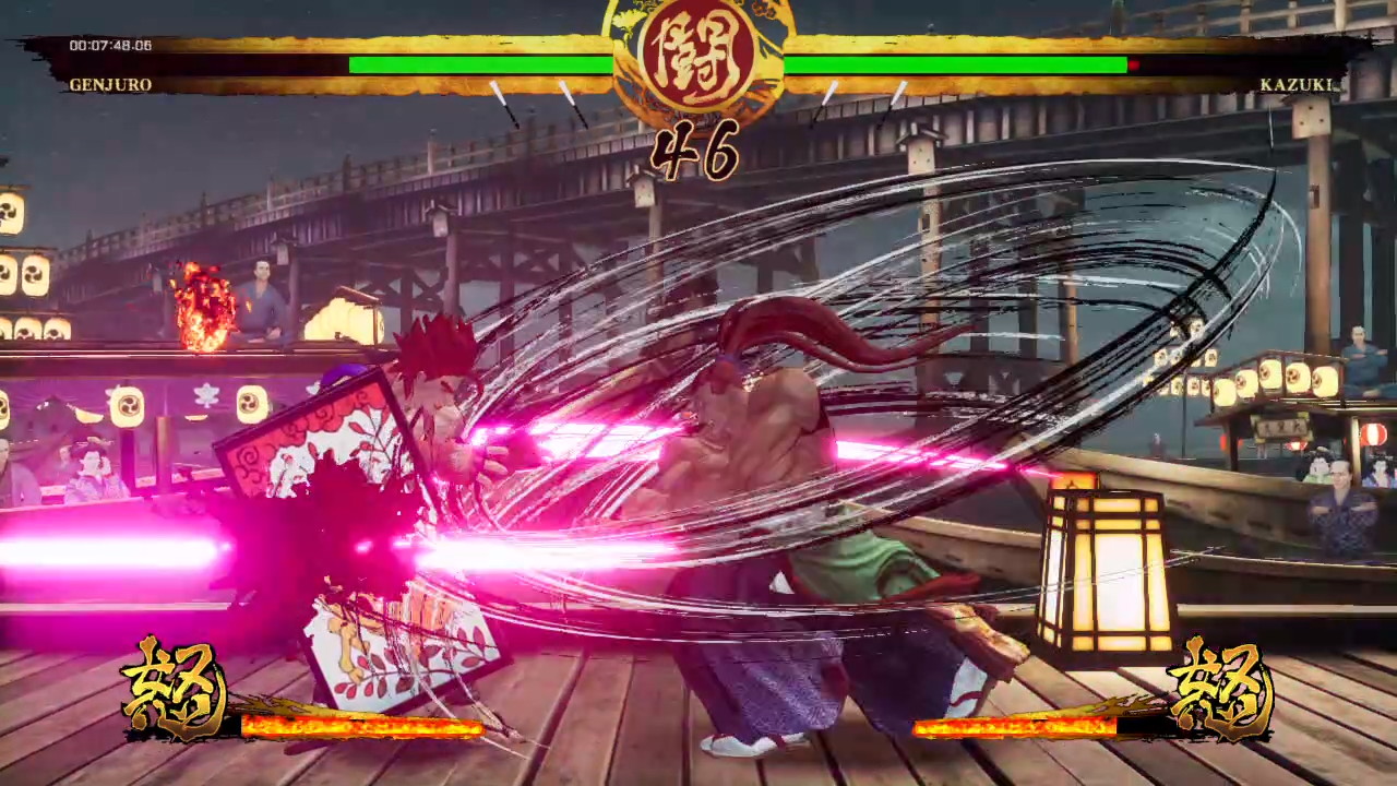 Oui, avant de prendre en main le jeu, vous trouverez sans doute l’animation pataude et lente, mais en main, il n’en sera rien. La puissance des coups, la durée des combats, les mouvements tout donne finalement la sensation de fluidité. La direction artistique choisie a aussi tendance à donner du vivant dans l’animation. Si je n’ai pas trop accroché dans Street Fighter IV a ses effets visuels particuliers rappelant les grands traits de Kanji au pinceaux, ici c’est totalement raccord avec l’esprit qui se dégage du jeu. Samurai Shodown ne trahi pas ses origines qu’elles soient vidéo-ludique ou nippone avec un esprit proche de celui d’Okami, façon papier et calligraphie. On le voit d’ailleurs très bien lors des gros plans. On adhère ou pas, mais SNK ne ment pas. C’est d’ailleurs le même ressenti sur l’ambiance visuelle des décors dans les niveaux qui sont parfois contemplatifs. On pourra remarquer des baisses de framerate, déjà présentes sur les versions One et PS4, mais il s’agit simplement des mêmes que sur la version originale de 1993 où certains coups paraissaient être au ralenti. Je trouve à juste titre que c’est très respectable de la part de SNK de reproduire le même effet. Dans les musiques également. C’était déjà très beau en 1993 sur le premier épisode, puis encore plus sur le quatrième, et ici une fois encore le développeur met un point d’honneur à respecter son passé et ses origines. Un régal.