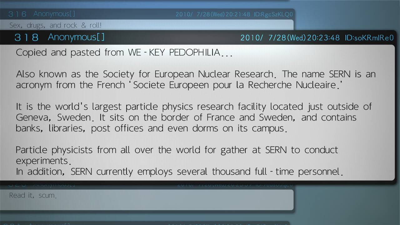 Hors de question de spoiler, mais si vous êtes amateurs du thème de voyage dans le temps, vous allez passer un très bon moment (si vous parlez bien anglais). Tout d’abord le jeu se base sur des faits et des théories connues (des essais qui ont eu lieu, des rumeurs mais aussi des travaux du CERN -ici appelé SERN-), mais aussi de par l’ambiance que dégage le jeu. Tantôt sérieux, dramatique ou bien un peu décalé, avec de l’humour, Steins;Gate Elite se veut attirant et passionnant et cela durant plus de 30 heures.