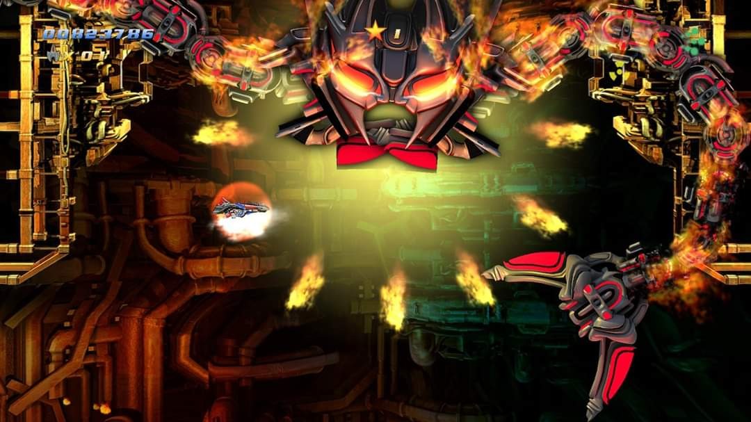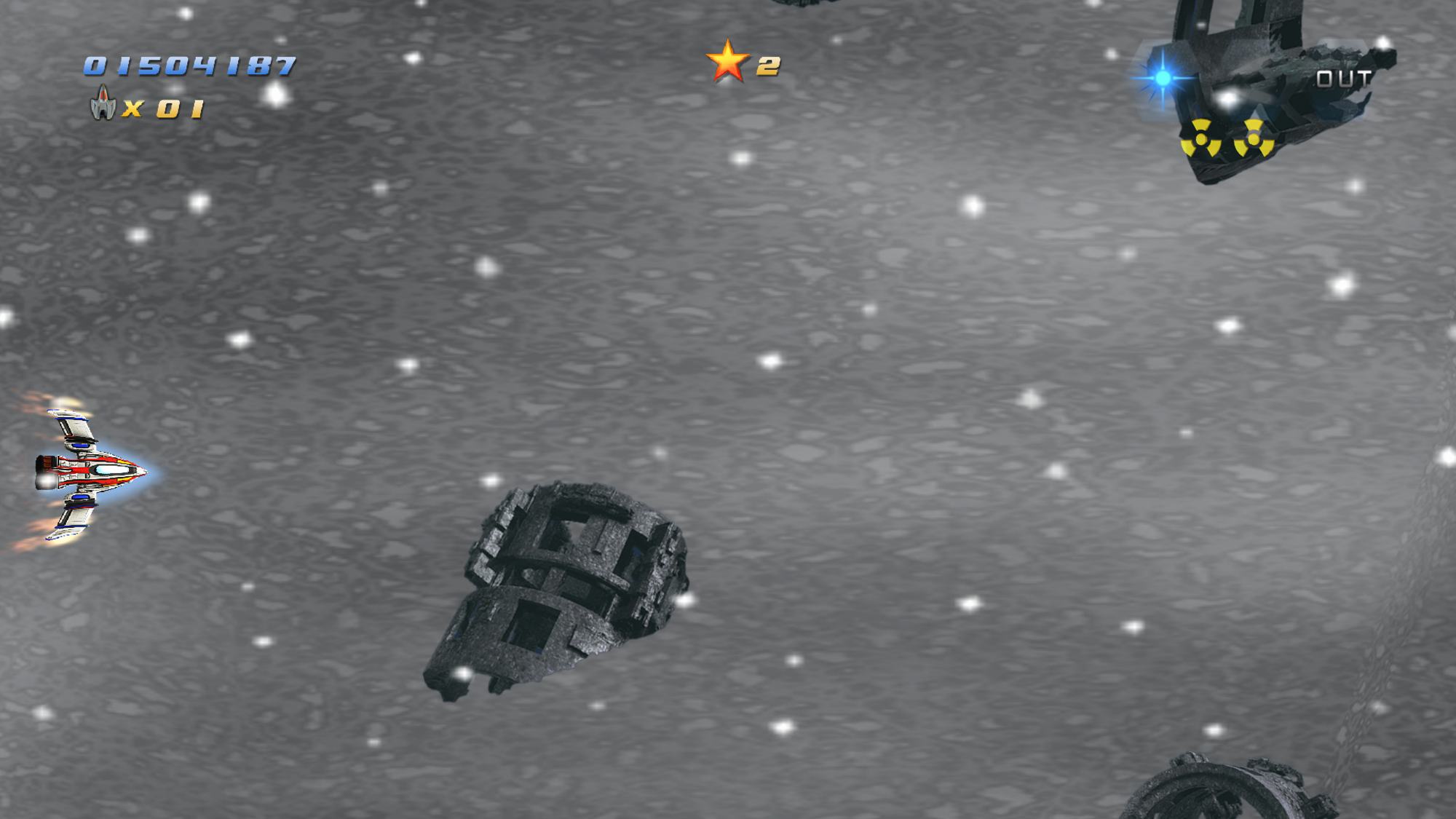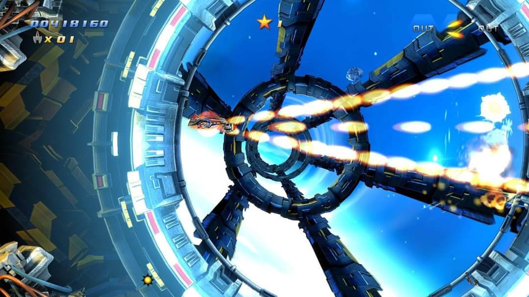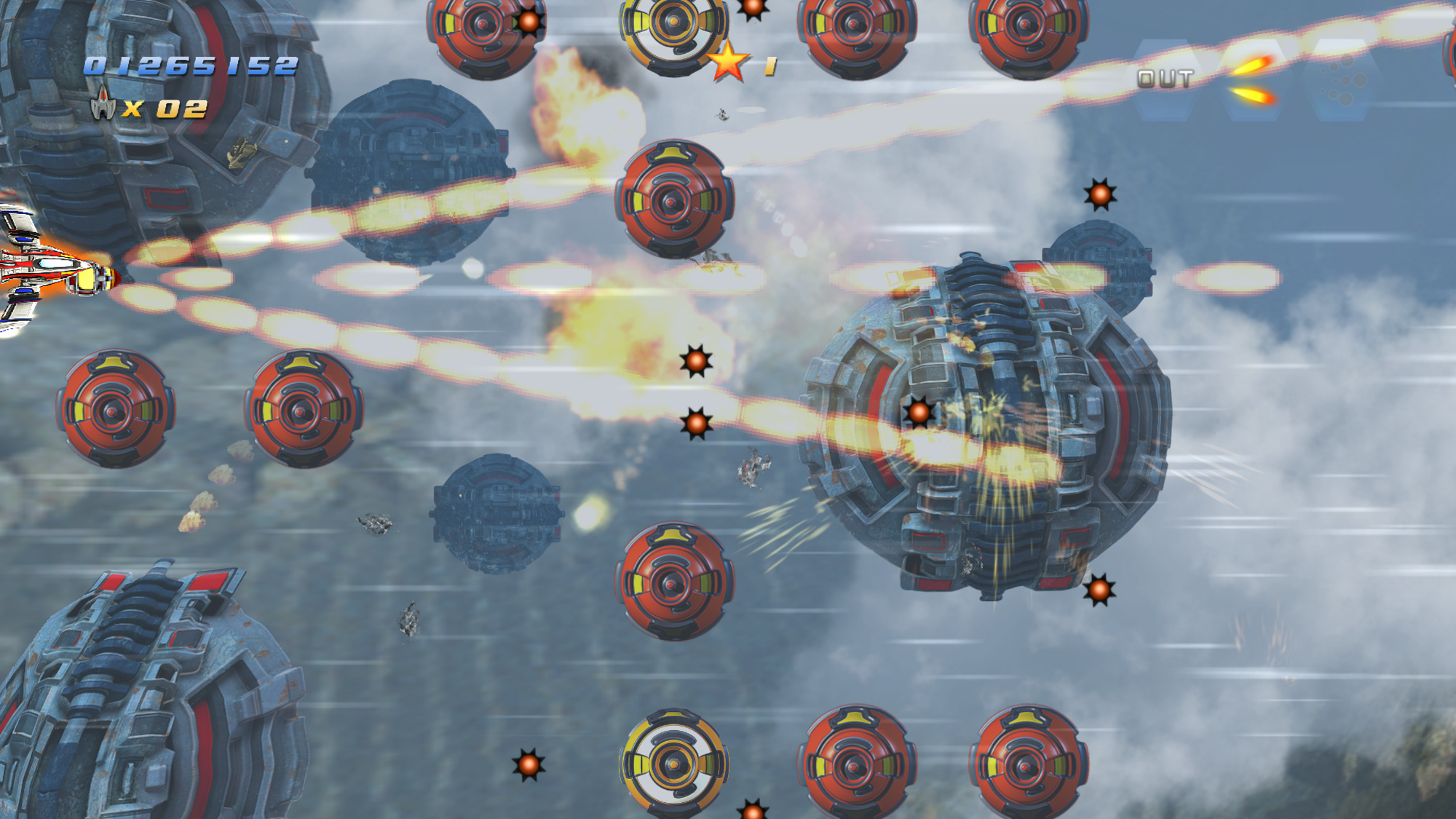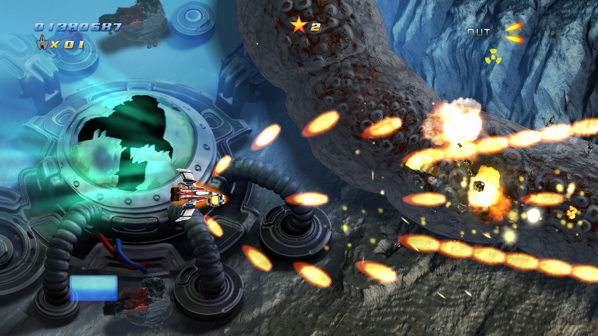 Heureusement, le jeu reste très agréable avec un système de tir vraiment bien foutu et une difficulté aux petits oignons que cela soit en mode Arcade ou Mission. Dans ce dernier il faudra traverser et survivre à 16 niveaux au game design très bien imaginés, à quelques exception près. Avant de débuter sachez que votre vaisseau possède 2 vies qui sont liées à vos tirs. Composés de trois, ils permettent en effet de survivre à 3 touchés puisque l’arme dont vous êtes équipé disparaît et laisse place à la suivante. C’est donc uniquement lorsque vous perdez votre dernière arme que vous perdez aussi une vie. Cependant, durant le run vous pourrez récupérer ces armes en éliminant certains adversaires, de quoi retrouver la forme assez rapidement. Un peu à la façon d’un Thunderforce il faudra switcher vos armes pour les sélectionner à la différence que chacune d’entre elles pourra gagner en puissance si vous continuez à ramasser les bonus de la même couleur. Notez enfin que tirer sur le bonus le fait changer de couleur, à vous de voir si vous désirez gagner en puissance ou récupérer une arme perdue. Tout ceci n’est évidemment pas à prendre à la légère, d’autant qu’un aspect technique est à prendre en compte : les ennemis peuvent aussi venir de derrière. A vous de choisir la bonne arme pour vous défendre aussi l’arrière train. Enfin, en plus de l’habituelle bombe, vous avez aussi la possibilité de charger vos tirs; Mais il ne faudra pas oublier de relâcher le bouton sous peine de les voir ‘exploser entre vos mains’ si vous les chargez trop.