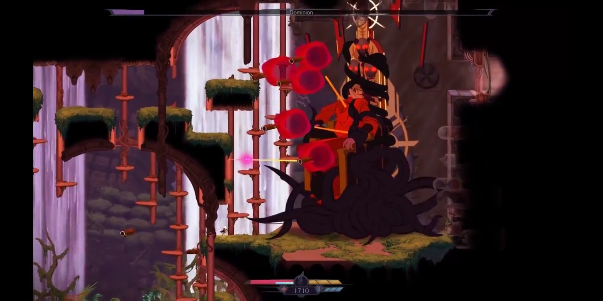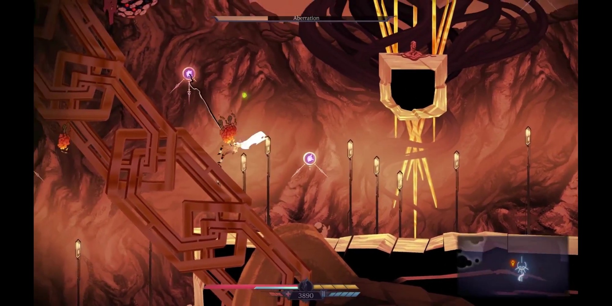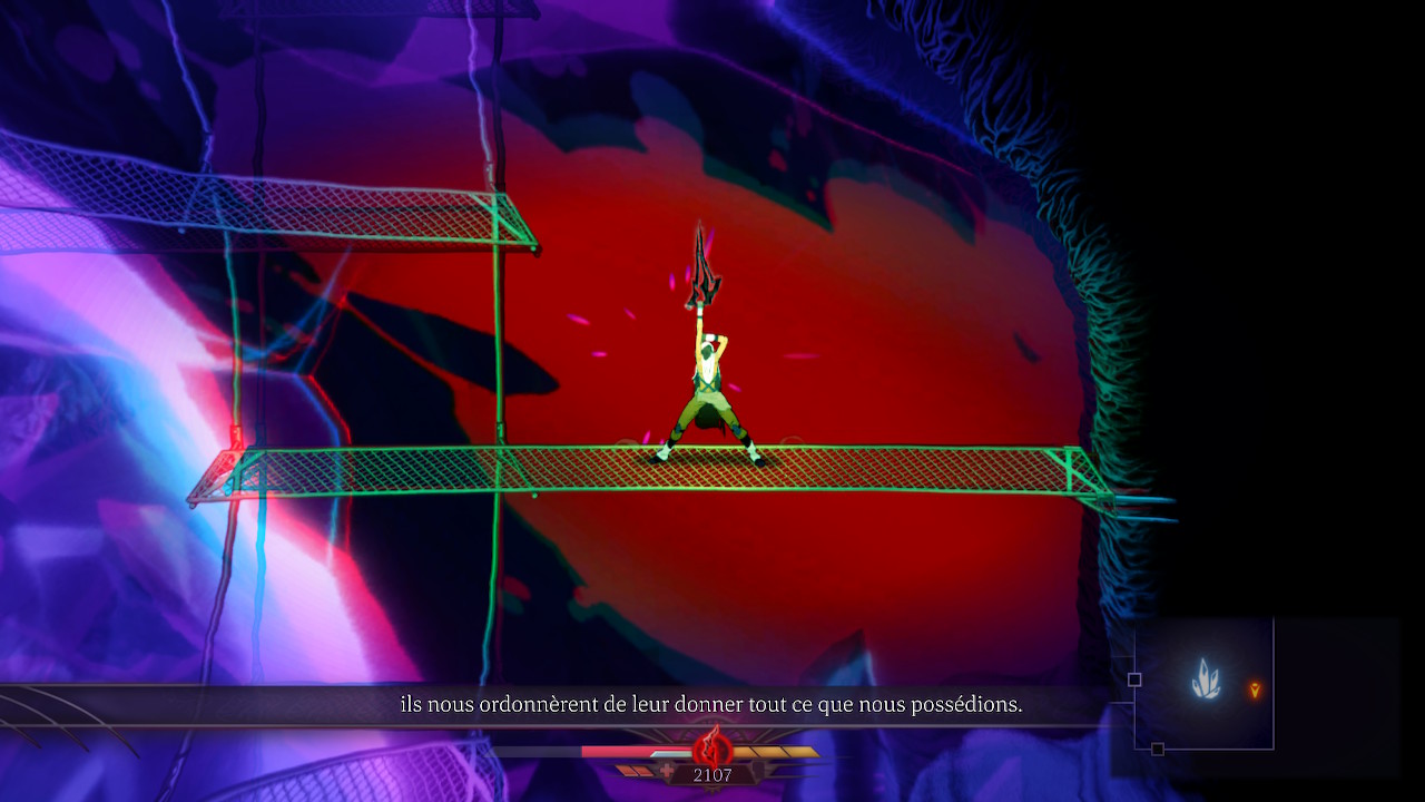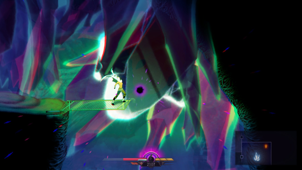 Thunder Lotus Games a fait en sorte que la progression soit très progressive. La difficulté ne sera pas pour autant faible, car comme tout Rogue Like qui se respecte (à croire que Metroid et Castlevania était déjà des Die & Retry) vous allez mourir souvent. Mais trouver rapidement les autels permettant d’apprendre de nouveaux pouvoirs sera votre priorité. Double saut, grappin, voler, feront partis de vos capacités par la suite vous permettant de découvrir de nouvelles salles mais surtout de ne pas vous faire massacrer par les vagues d’ennemis. Ce promener et découvrir de nouvelles routes, s’enfoncer toujours plus loin dans ce monde malsain est un pur bonheur. Et malgré les multiples morts, malgré la répétitivité constante, on prend un plaisir embrassant à recommencer encore et encore.