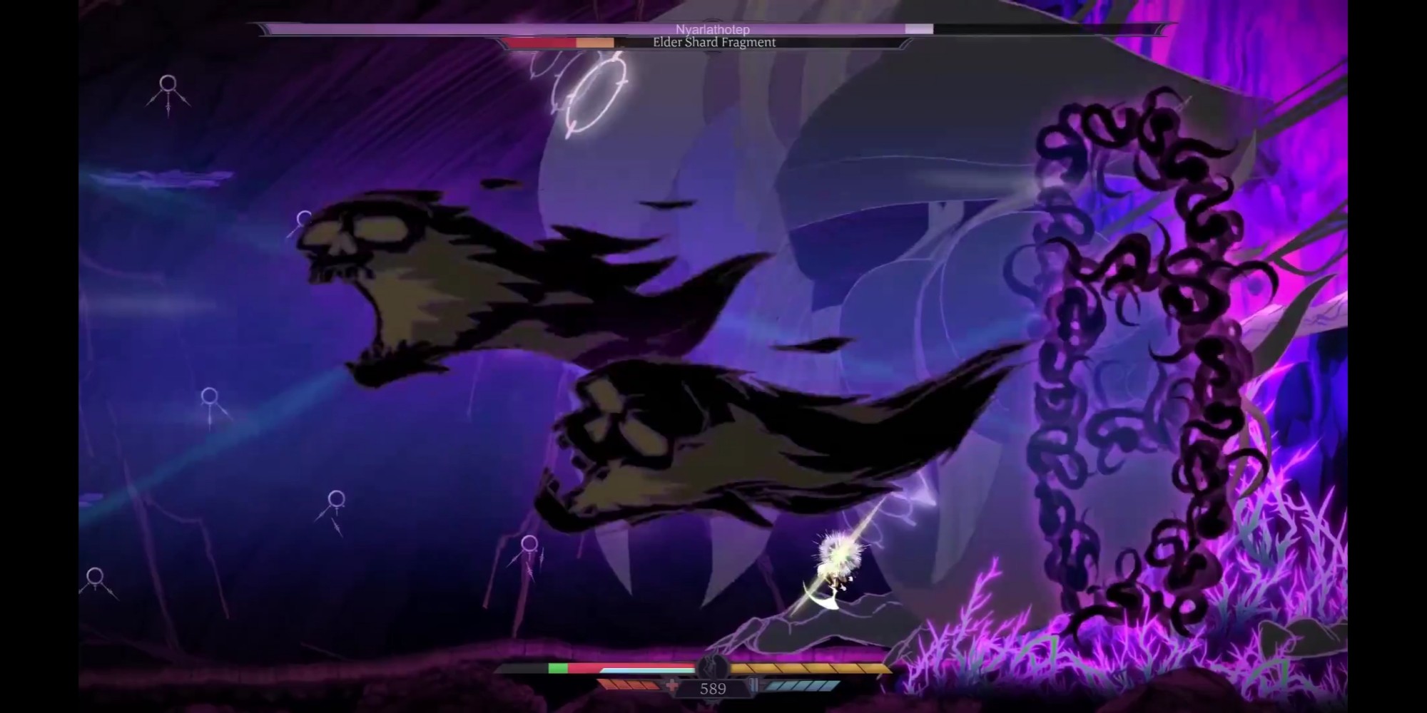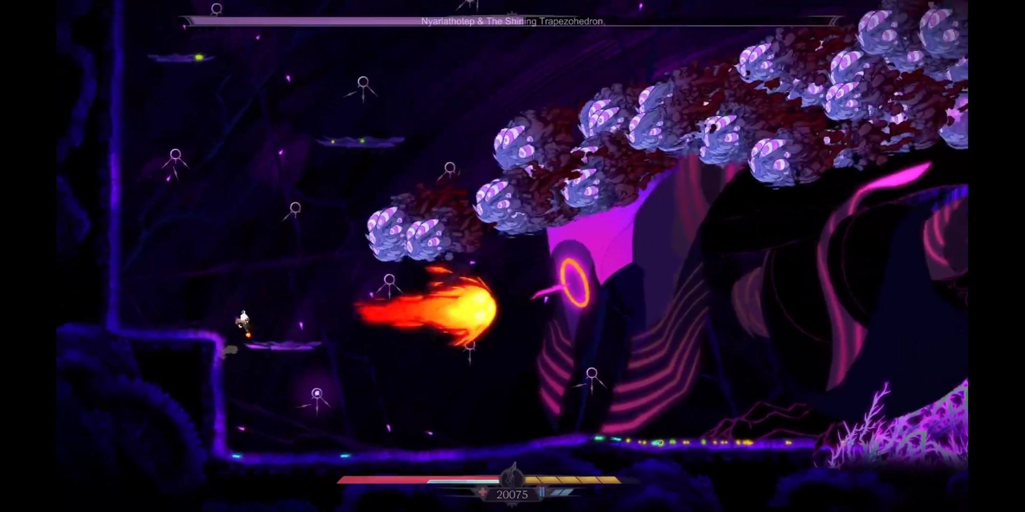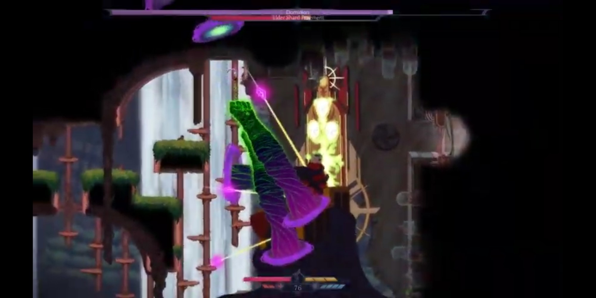 Thunder Lotus Games a fait en sorte que la progression soit très progressive. La difficulté ne sera pas pour autant faible, car comme tout Rogue Like qui se respecte (à croire que Metroid et Castlevania était déjà des Die & Retry) vous allez mourir souvent. Mais trouver rapidement les autels permettant d’apprendre de nouveaux pouvoirs sera votre priorité. Double saut, grappin, voler, feront partis de vos capacités par la suite vous permettant de découvrir de nouvelles salles mais surtout de ne pas vous faire massacrer par les vagues d’ennemis. Ce promener et découvrir de nouvelles routes, s’enfoncer toujours plus loin dans ce monde malsain est un pur bonheur. Et malgré les multiples morts, malgré la répétitivité constante, on prend un plaisir embrassant à recommencer encore et encore.